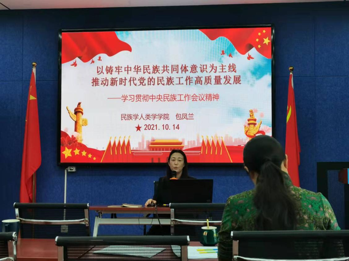 10月14日下午,AC米兰官网党委书记包凤兰在田楼615会议室为全院教工做了题为“以铸牢中华民族共同体意识为主线,推动新时代党的民族工作高质量发展”的有关中央民族工作会议精神的宣讲。