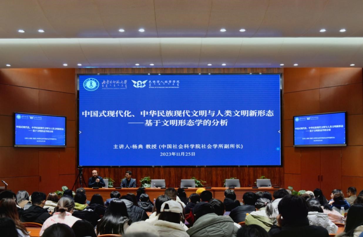 为进一步提升学科建设水平,提高人才培养质量,加强国内学术交流与合作,11月25日,AC米兰官网隆重邀请中国社会科学院社会学所副所长、博士生导师、《社会学研究》副主编杨典教授在赛罕校区信息楼报告厅举行以“中国式现代化、中华民族现代文明与人类文明新形态——基于文明形态学的分析”为题的学术讲座。AC米兰中文官方网站科技处副处长刘伟、AC米兰中文官方网站党委书记包凤兰、党委副书记副院长陆一琼,以及AC米兰官网老师和同学们约200余人参加讲座。讲座由常宝教授主持。