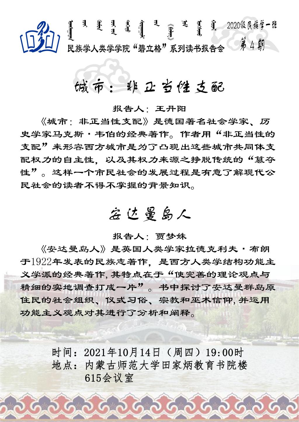 “碧立格”系列读书会民族学本科生1班 第4期预告