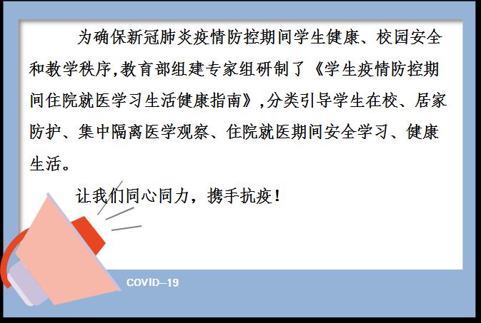为落实国家发布的学校新冠肺炎疫情防控技术方案,支持学校封闭式管理、常态化防控和应急性处置,引导学生安全学习、 健康生活,健康教育专家为学生疫情防控期间住院就医学习生活提出以下建议。