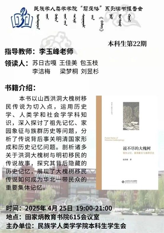 6位领读同学通过梳理章节内容、整理思维导图等方式对《说不尽的大槐树》一书进行了深刻的解读。他们从作者生平、叙述方式和书籍主旨等不同角度进行研究切入,并结合自身理解和个人感悟,挖掘作者的内心世界和写作意图,探索书中涉及的时代制度及特征。《说不尽的大槐树》不仅是一部学术著作,也是一本具有广泛社会影响力的书籍,它帮助读者理解大槐树移民传说背后的历史背景和文化意义,并促使人们重新审视家族记忆与族群认同的关系。