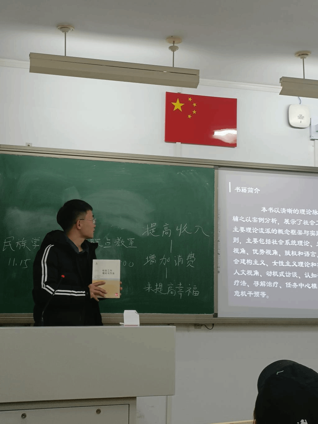 20211115日傍晚7时,在盛乐校区行知楼217教室,2021级社会工作本科2班举行了第1“碧立格”读书报告会。指导老师胡那苏图参与了此次会议。由包吐气同学为首的6名同学对《社会工作理论与方法》这本书进行了分享报告。