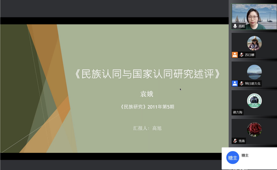 高旭同学分享的论文是《民族认同与国家认同研究述评》,发表于《民族研究》2011年第5期。高旭同学首先介绍了论文作者、发表期刊等基本概况,其次重点介绍了该述评的主要内容,研究意义等。文章主要包括三个部分,分别是多维视野下对民族认同研究的聚焦,国家认同与社会秩序的生成以及“民族认同”与“国家认同”关系的三种模式,即矛盾冲突关系、调适共生关系、权力运用关系,从综合性、历时性的动态视角对民族认同与国家认同变迁的研究进行梳理。