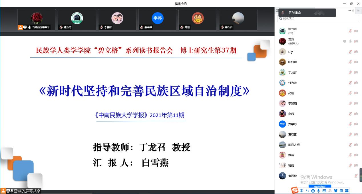 2022年5月8日下午3:00,AC米兰中文官方网站2020级、2021级博士研究生通过“腾讯会议”举行了第37期读书报告会。本次读书报告会的汇报者是2020级马克思主义民族理论与政策专业李慧茹、2021级马克思主义民族理论与政策专业白雪燕两位博士生。博士生导师丁龙召教授出席本次读书报告会并进行指导。