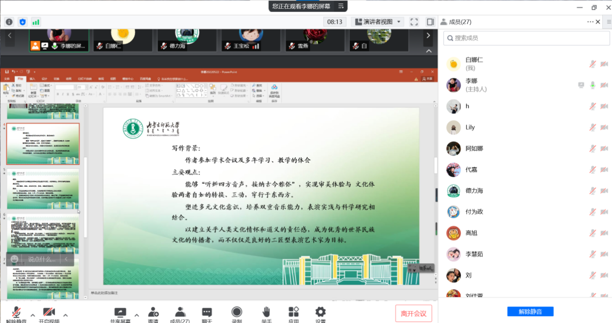 李娜同学分享了杨民康老师发表在《中央音乐学院学报》2018年第二期的论文《审美、文化、美术:音乐认知和体验的三重境界——兼论文化多样性教育语境中的作曲与表演人才培养》。结合自身的学习和教学经验,分享人对论文做了充分多方位的解读,尤其是文中主要观点,即能够“听辨四方音声,接纳古今雅俗”,实现审美体验与文化体验两者自如的转换、互动,穿行于东西方;塑造多元文化意识,培养双重音乐能力,表演实践与科学研究相结合;以建立关乎人类文化情怀和道义的责任感,成为优秀的世界民族文化的传播者,而不仅仅是良好的工匠型表演艺术家为目标。基于观点,倡导实际教学工作中通过民族音乐思维,观点、方法,确立起多样性音乐文化观;增加民族音乐学课程作为作曲专业和民乐表演专业研究生的必修课或选修课;走出课堂,尽可能多地参与外部社会的文化活动、田野考察及表演实践。最后,从音乐师范类本科生的多元音乐文化观的建立和通过新时代网络媒体讲好中国音乐故事等两个方面做了个人理解和展望。