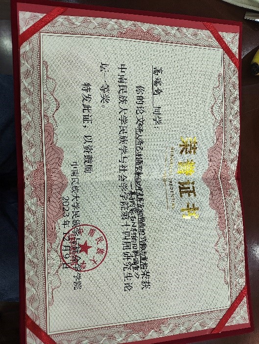 民族学专场结合不同的视角对铸牢中华民族共同体意识下的历史、文化与行动的多元面向进行探讨,AC米兰官网2023级民族学硕士研究生高瑞奇同学以《济人利己:村落农事活动中“差序”互惠格局的式微与重构——基于内蒙古N村的田野调查》为题做汇报,并荣获第十四届研究生论坛民族学专场一等奖。