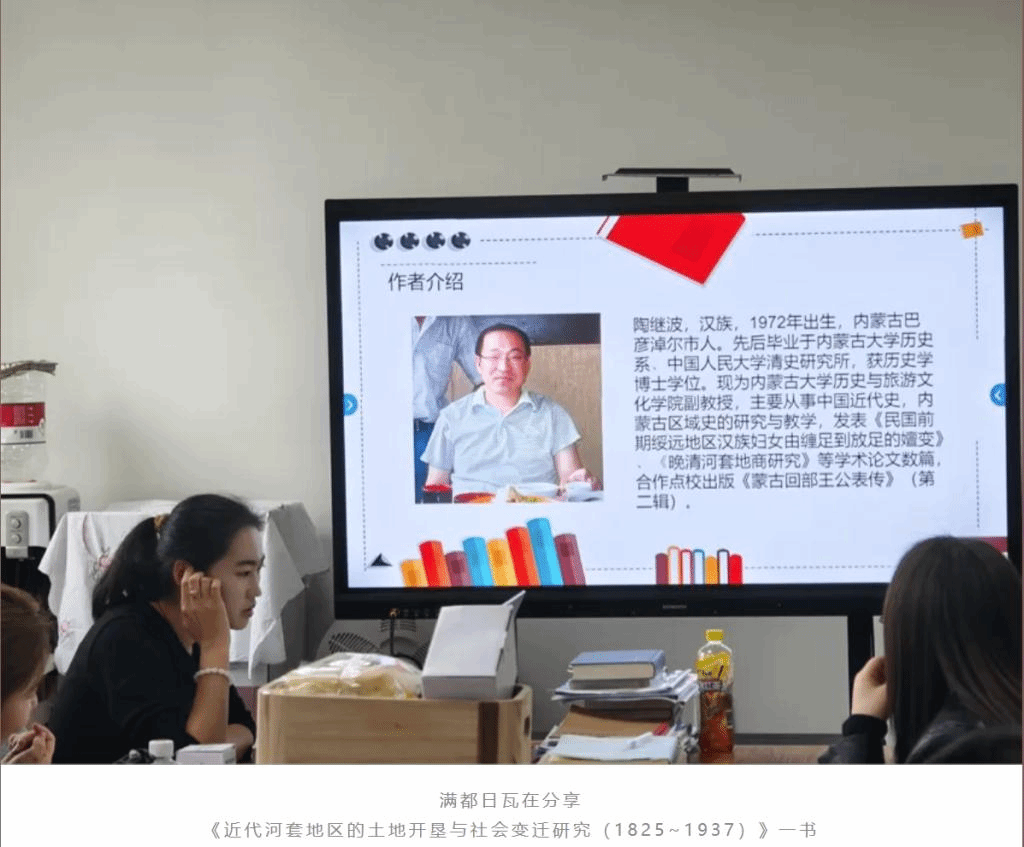 接着满都日瓦分享了内蒙古大学历史与旅游文化学院教授陶继波的著作《近代河套地区的土地开垦与社会变迁研究(1825~1937)》一书。此书探讨了围绕河套区域诸多方面的内容,包括近代河套地区的土地开垦背景、过程、影响等一系列问题。清末由于内地人地矛盾逐渐突出,加之边疆危机和财政需求使朝廷改变了相关政策,在所谓的“移民实边”等政策下内地民人大量涌入中国北部边疆地区。自古“黄河百害,唯富一套”,河套地区自然条件良好,也是各民族生息繁衍的重要场域。但在新政以后的“官垦”政策下河套地区被陆续开垦和开发。其中水利工程等各项开发积极开展,范围不断扩大。这些开垦和开发活动深刻影响了河套地区自然与人文环境,包括农业发展、经济转型、人口结构变化和社会组织演变、城镇兴起等。同时破坏生态、社会矛盾加剧等问题也接踵而来,一定程度上影响了社会的稳定和安全。满都日瓦同学对全书内容进行了全面的解读,并结合PPT生动展现出了该书结构、内容,指出来该书所涉猎内容的全面和深刻以及移民和当地各族人民共同开发河套地区,彼此交往交流交融,成为今天的局面。同时提出,这本书虽然充分利用了垦务档案,但对蒙旗多语种档案未能予以关注和利用,因此无法细致探讨蒙旗社会变迁情况。在场的同学们仿佛看到了当时河套这片土地的场景。大量移民与当地少数民族共同生活,各民族文化相互渗透,形成独特的地域文化。